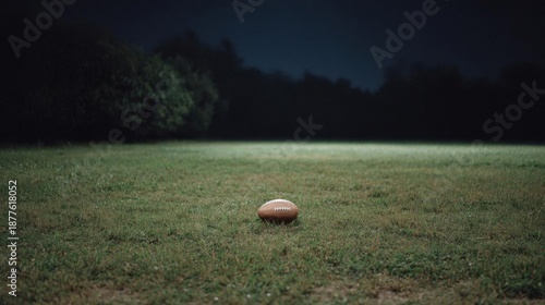 american, football, lying, grassy, field, night, lit, moonlight, soft, glow, grass, sky, dark, tree, background, silhouetted, center, ball, facing, right, frame, low, angle, outdoors, sport