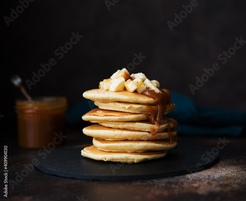 fried, gastronomy, black, background, dark, closeup, butter, prepared, dressing, milk, hot, snack, traditional, gold, morning, topping, round, banana, homemade, sweet, fresh, breakfast, dessert, pastry, meal, food, cooked, caramel, bakery, sauce, american, stack, lunch, maple, sirup, cookery, table, honey, plate, receipe, fruit, culinary, battercake, buttermilk, pile, tasty, baked, nourishment, delicious