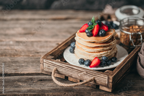 American pancakes with fresh berry on wood background. Summer homemade breakfast.