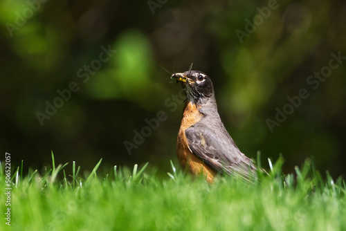 American Robin in the grass with its beak filled with insects. Captured in Richmond Hill, Ontario, Canada.