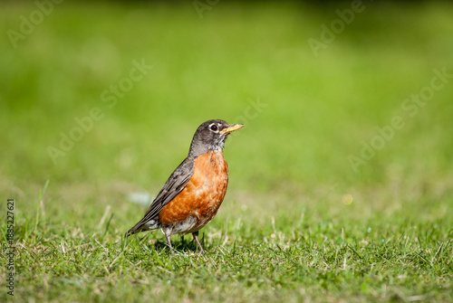 American robin on a grassy lawn hunting for worms