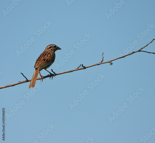 American Tree Sparrow Bird Perched on Bare Tree Branch with Blue Sky Background