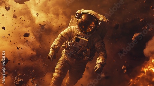 Amidst floating debris, rocks, and smoke, an astronaut boldly faces the vast unknown, braving explosive dangers.