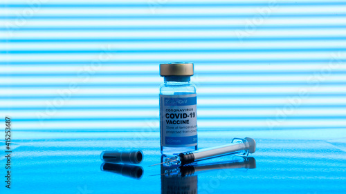 ampoules or vials with Covid-19 vaccine on a laboratory bench. SARS-CoV-2 Vaccination, immunization, treatment to cure Covid 19 Corona Virus infection. Medical concept.