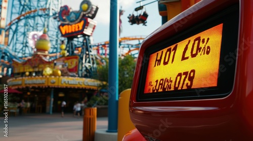 park, amusement, fun, roller, coaster, ride, summer, hot, sun, day, funfair, people, crowd, family, children, children, joy, happy, vacation, holiday, travel, tour tourism, adventure, thrill, excitement, energy, speed, motion, blur, bright, colourful, light, display, screen, digital, technology, information, humidity, temperature, time, clock, monitor, datum, number, percentage, red, orange, yellow