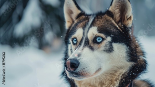 Amusing husky pet in outdoor portrait ahead of sled race
