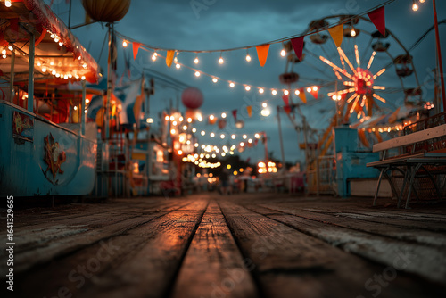 An abandoned carnival with broken rides, creepy Halloween lights, and eerie shadows.