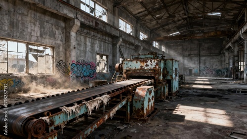 abandoned, industrial, machinery, dusty, conveyer, belt, rust-eaten, dilapidated, facility, interior, light, sun, hazy, grey, concrete, graffiti, wall, window, broken, large, space, building, sunlit, shadow, dust, machine, faded, muted, colours, empty, desolate, decaying, beautiful, colourful, bright, creative, modern, elegant, stylish, professional, decorative, vibrant, stunning, amazing