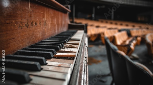 piano, abandoned, key, theatre, empty, memory, music, history, dusty, decay, vintage, classical, performance, silence, melody, instrument, disused, worn, nostalgia, art, past, acoustic, aged, environment, story, forgotten, venue, atmosphere, antique, retro, dramatic, interior, echo, tune, symphony, old, heritage, beauty, music hall, stage, scene, graceful, character, mystery, ambience, mood, weathered