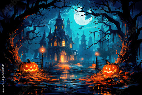 background, grunge, design, tree, party, silhouette, house, halloween, face, art, castle, horror, scarey, ghost, fear, evil, pumpkin, night, mystery, dark, autumn, skittish, holiday, haunted, creepy, grave, cemetery, generative, ai, moon, poster, monster, celebration, light, bat, trick, mysterious, light bulb, forest, zombie, devil, thriller, nightmare, fable, symbol, cross, window sill