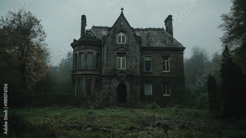 house, luxury home, abandoned, stone, grey, fog, tree, forest, overgrown, window, door, old, eerie, skittish, mysterious, gothic, architecture, building, facades, vintage, weathered, rustic, nature, landscape, dark, gloomy, misty, cloudy, sky, grass, green, moss, ivy, creepy, haunting, desolate, lonely, forgotten, decay, silence, stillness