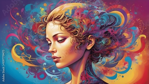 An abstract artwork depicting a woman's mind of a person with auditory hallucinations, surrounded by vivid, swirling colors, symbolizing creativity and imagination