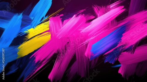 An abstract digital artwork features vivid pink and blue brushstrokes with hints of yellow, creating a dynamic and modern composition
