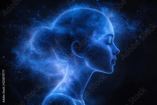 An abstract digital background featuring an image forming the shape of a mother and son embracing, highlighted by connecting data points in blue and black colors.
