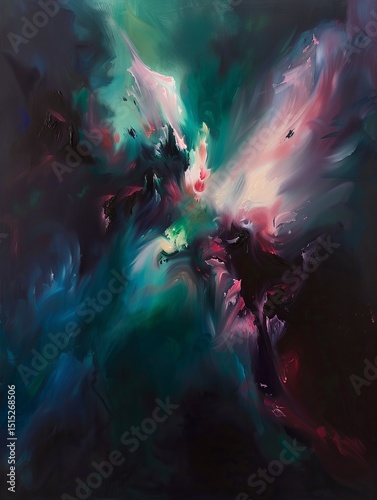 An abstract expressionist painting depicting a cosmic nebula, with intense, swirling colors