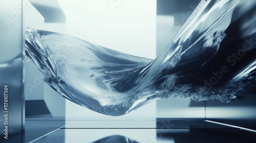 An abstract futuristic glass wave flowing in a dynamic, sleek design, set against a clean geometric background, creating a high-tech vibe.