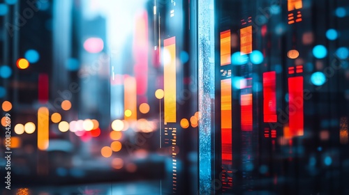 An abstract illustration featuring a glowing big data candlestick chart overlaying a blurry city backdrop.