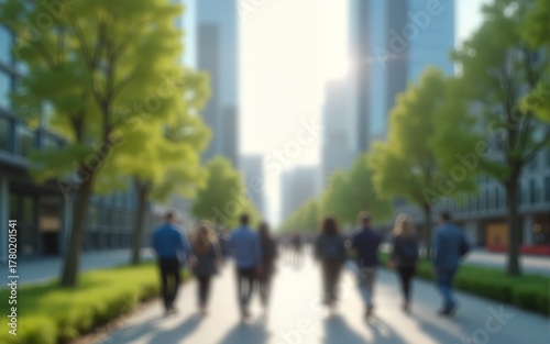 An abstract image of business people walking in a corporate office area located in a green city downtown. The blurred background highlights sustainable urban elements, including eco-friendly buildings