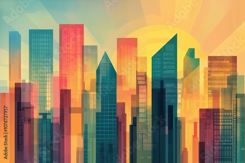 An abstract interpretation of a cityscape showcases colorful buildings merging at sunset, creating a captivating depth