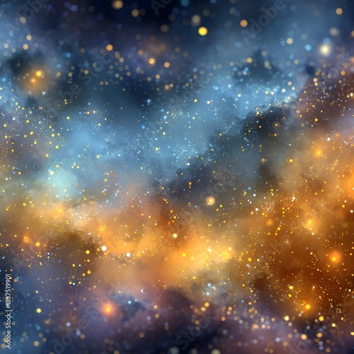 An abstract nebula background showcases blue, gold, and orange hues with bright glowing specks of light resembling distant stars in space art.