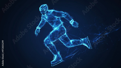 An abstract representation of an ice hockey player, designed with a blue polygonal and low poly wireframe style. The player’s silhouette is rendered in a thin line cybernetic fashion, highlighting dyn