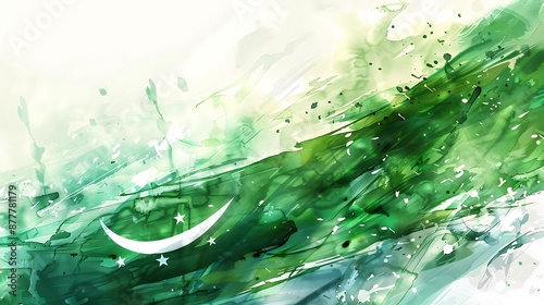 An abstract watercolor painting of the Pakistani flag, with bold brushstrokes and dynamic splashes of green and white capturing the spirit of independence and unity.