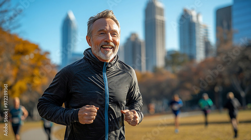 An active older man enjoying a morning run in the city park, surrounded by modern skyscrapers and fellow joggers.