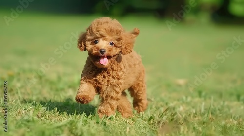 An adorable brown poodle puppy dog sprinting merrily on the grass, displaying its youthful energy and lively charm. A heart - warming scene of a puppy at play.