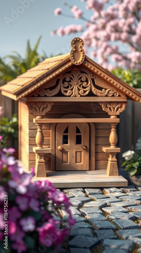 An adorable intricately crafted vintage wooden dog house.