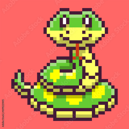 An adorable pixel art snake character designed in a friendly, retro 8-bit gaming style. This cute serpent mascot is coiled with a gentle smile brings a playful and nostalgic feel