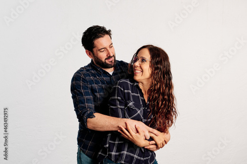 adult, couple, woman, man, plaid, shirt, smiling, white background, studio, camera, male, female, portrait, background, shot, together, thumb, up, happy, isolated, white, standing, showing, success, young, gesture, signs, cheerful, positive, studio shot, photogenic, human relationships, wife, casual attire, lifestyle, excited, horizontal, husband, indoor, joy, 2, love, symbol, hand, cool, finger, marriage, toothy