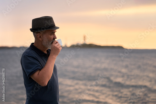 An adult gray-haired man in a hat on the beach with a cup of coffee. He looks at the sea in the rays of the setting sun. Copy space.