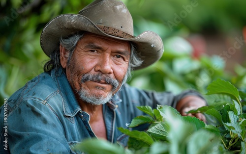 An adult Hispanic person tends to vibrant plants in an urban farming setting, showcasing dedication to sustainable agriculture