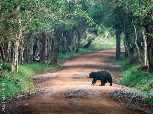 An adult sloth bear (Melursus ursinus) crossing the road in Wilpattu National Park, Sri Lanka