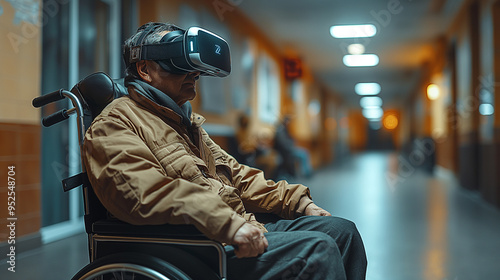 an adult with disabilities, a disabled person with virtual reality glasses, a world of possibilities, dreams, motivation