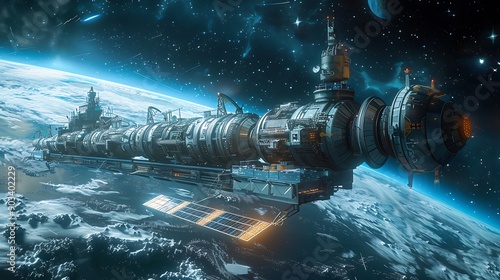 An advanced space station floating in deep space, with solar panels and docking ports, surrounded by stars and a nearby planet. Created using: high-resolution camera, wide-angle lens,