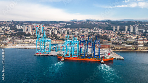 An aerial drone view shows a cargo ship delivering new cranes to Rijeka’s modern cargo terminal port, boosting logistics and trade. This upgrade strengthens Rijeka’s role as a key Adriatic port