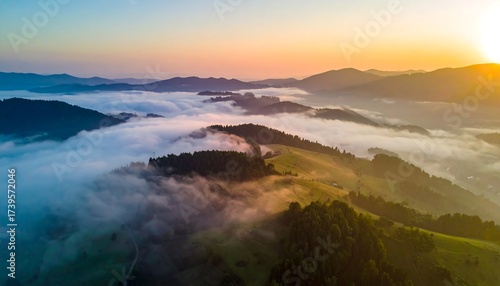 An aerial view displays a vibrant sunrise over a mountain range, thick fog nestled in valleys, creating a serene natural scene. The sun's glow bathes the landscape