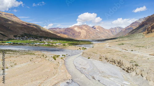 An aerial view of himalayan mountains at dhar dindi chichong village and spiti river in the Indian state of himachal pradesh.