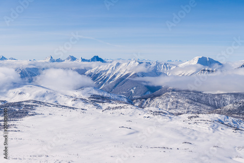An aerial view of the Rocky Mountains in Alberta, Canada in winter