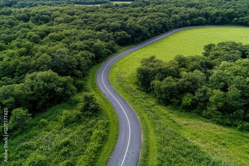 An aerial view showcasing a curved road that meanders through lush forests and adjacent fields, emphasizing the blend of nature and human-made paths in the countryside.