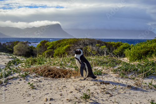 An African cape penguin isolated on white sands of boulder's beach cape town