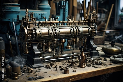 old, machine, table, aged, vintage, antique, equipment, metal, mechanical, intricate, detail, worn out, technology, obsolete, industrial, historic, display, rust-eaten, tool, apparatus, contraption, machinery, device, workbench, tabletop, worn, weathered, retro, artifact, artifact, metalwork, manufacturing, machine-building, gear, cog, industrial revolution, industrial design, craftsmanship, generative, ai