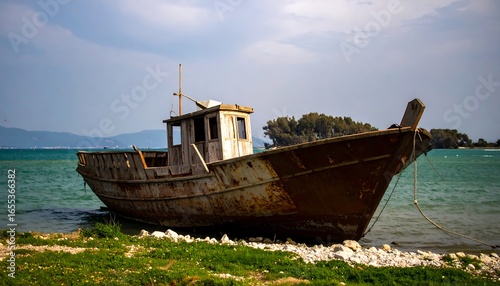 An aged, rusted fishing boat rests on a pebbled shoreline, showcasing the weathered beauty of a bygone era against a tranquil backdrop of turquoise water and distant mountains.