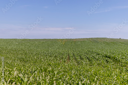 an agricultural field where young green corn grows