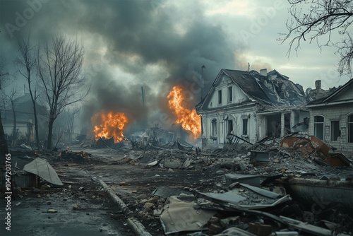 An AI gnenerative image of destruction caused by war with damage building and smoke