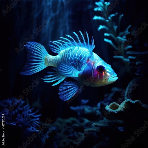 an AI Image Generator, Vibrant Blue Fish in Underwater Coral
