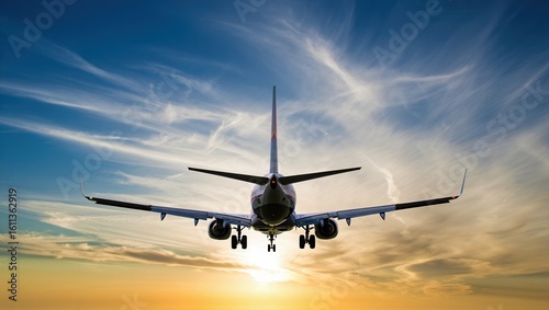 An Airplane Approaches for Landing Against a Beautiful Sunset Sky with Wispy Clouds, Capturing the Essence of Travel and Adventure