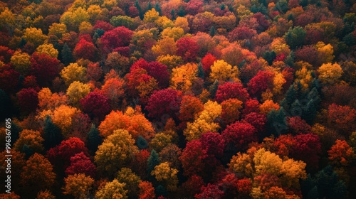 An amazing aerial view of a vibrant autumn forest, with a patchwork of red, yellow, and orange trees.