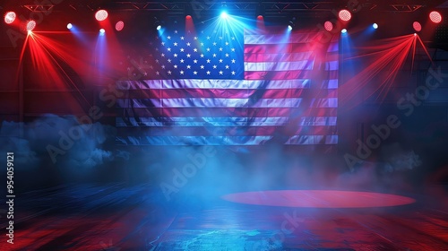 An American flag hangs in the air on a stage illuminated by spotlights and smoke.